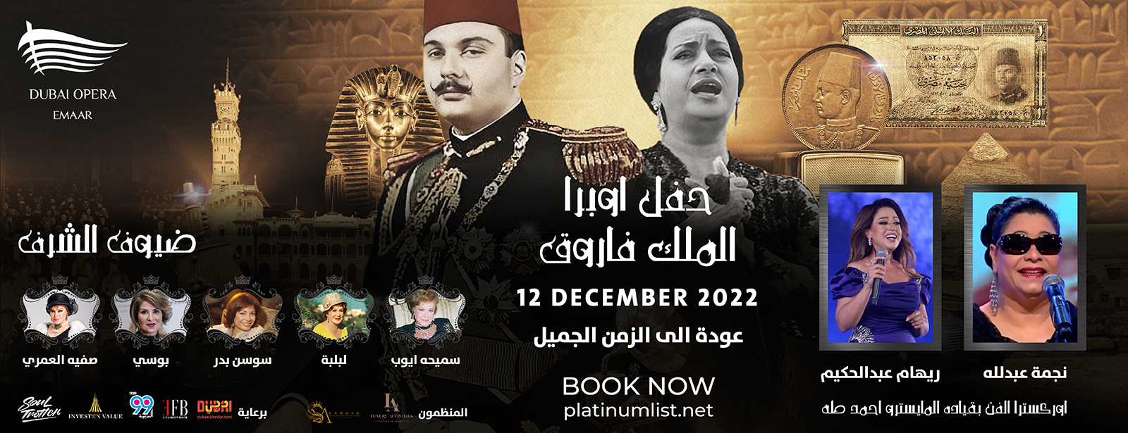 تستعد دبي أوبرا dubai opera لعرض الحفل الغنائي الضخم والحافل بالموسيقى الملك فاروق king farouk خلال 12 ديسمبر 2022 .