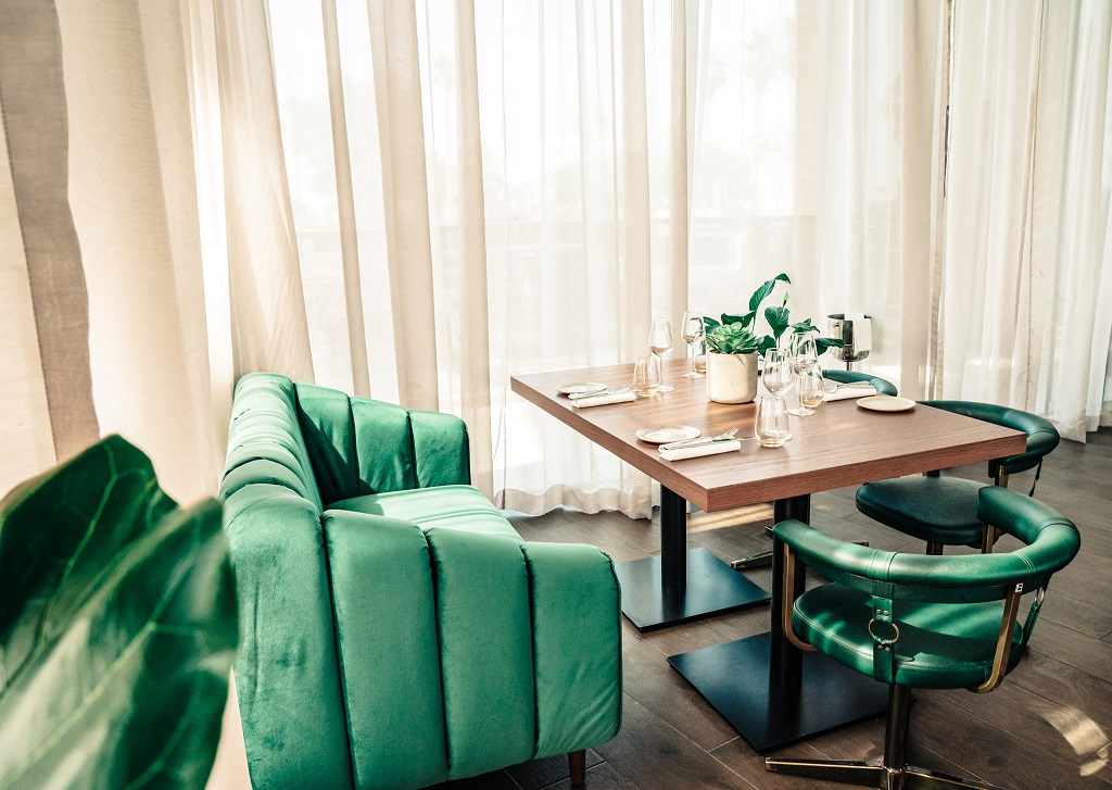 يمكن للضيوف الاستمتاع بالأجواء الداخلية الراقية للمطعم الفاخر المفعم بالألفة أو الجلوس على التراس الخارجي في الموسم البارد وتأمل المناظر الساحرة لملعب الجولف الذي تصل مساحته إلى 30 ألف قدم مربع